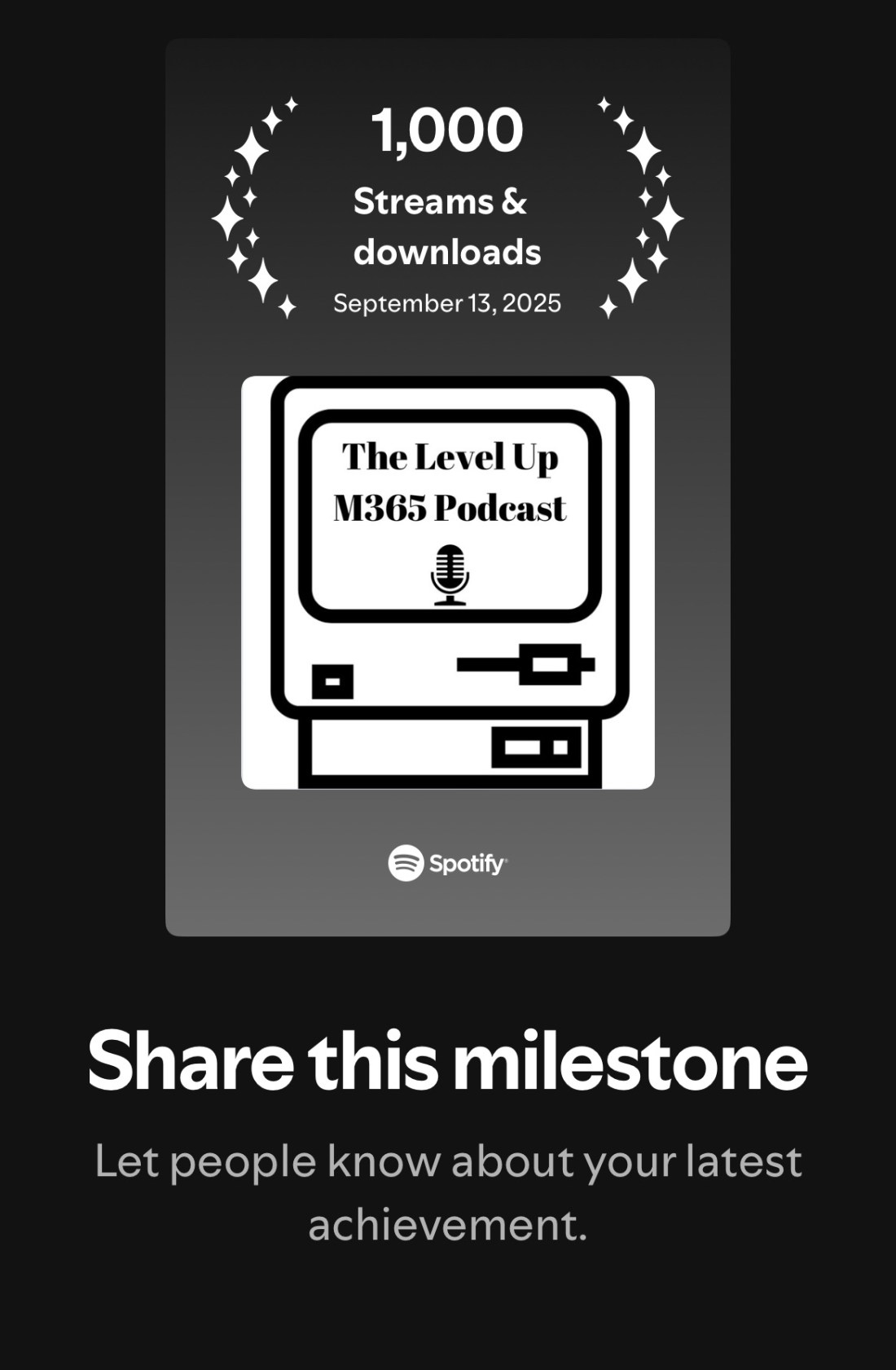 Spotify milestone achievement I know itโs modest but 1,000 plays is a great milestone achievement for me, a guy who mostly records m365 tricks from my car right before my 6:00 am pump. My wife is especially happy for this hobby. She was getting sick of me yapping about SharePoint lists or Loop components during … Continue reading New podcast milestone 1,000 plays!